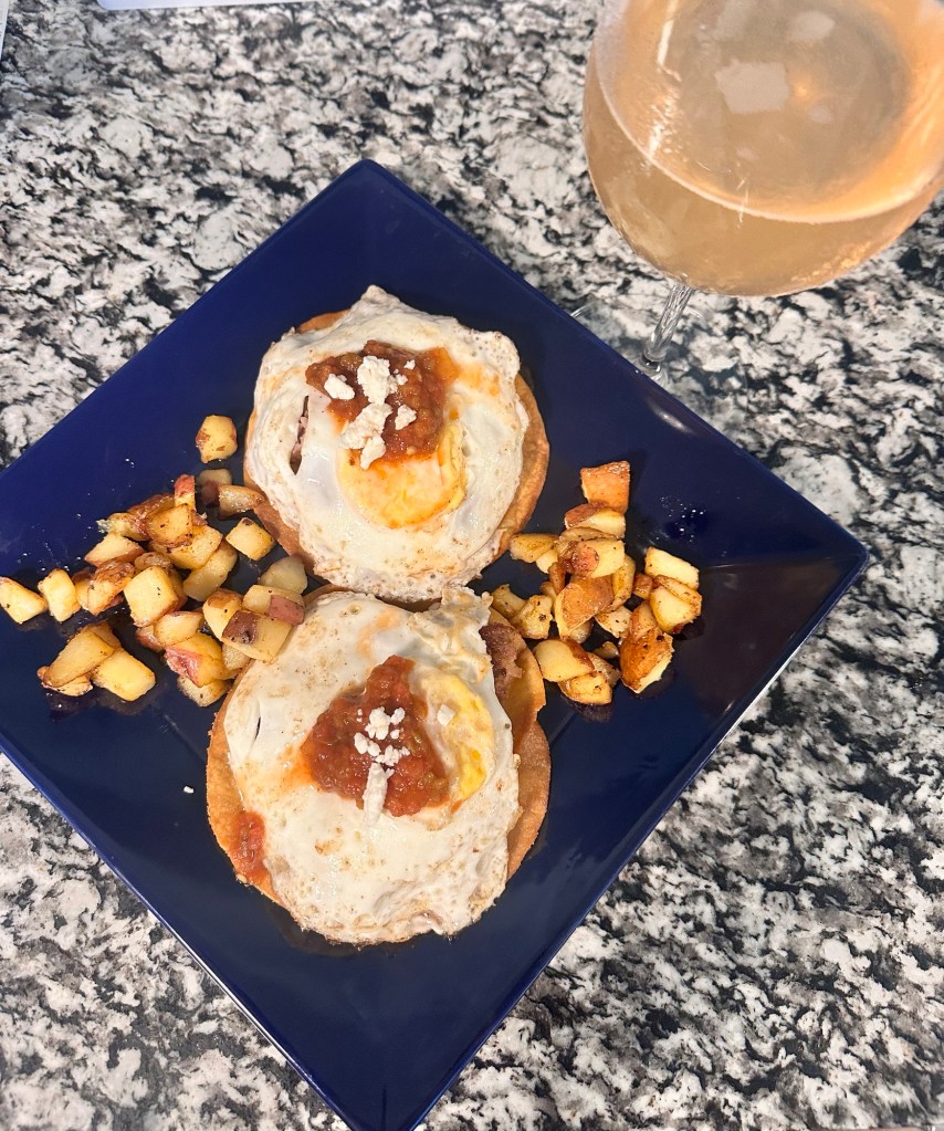 I love a good brunch but sometimes I just don’t feel like getting out. So then I invite a few friends over and do brunch at my house. My go to is a tostada topped with whatever breakfast meat I have in my fridge, over medium egg, cheese & salsa. Little red potatoes on the side. Delicious! For the tostada-a small amount of olive oil in the frying pan and heat up till a drop of water sizzles, then put a corn tortilla down and let it crisp up, flip and once crispy on both sides, remove and place on a paper towel to absorb any excess oil. Do this for all the tostadas. Plate and then add cheese….this helps the cheese melt and also provide a sticky surface for the meat. Cook whatever meat you prefer- I typically do either breakfast sausage patties or bacon and whatever excess grease, that’s what I use to cook the potatoes. Fry up some eggs- 1 egg per tostada and build your tostada. Tostada, cheese, meat, egg, salsa. If I have avocado slices I top with that. Potatoes on the side. Girl Brunch!