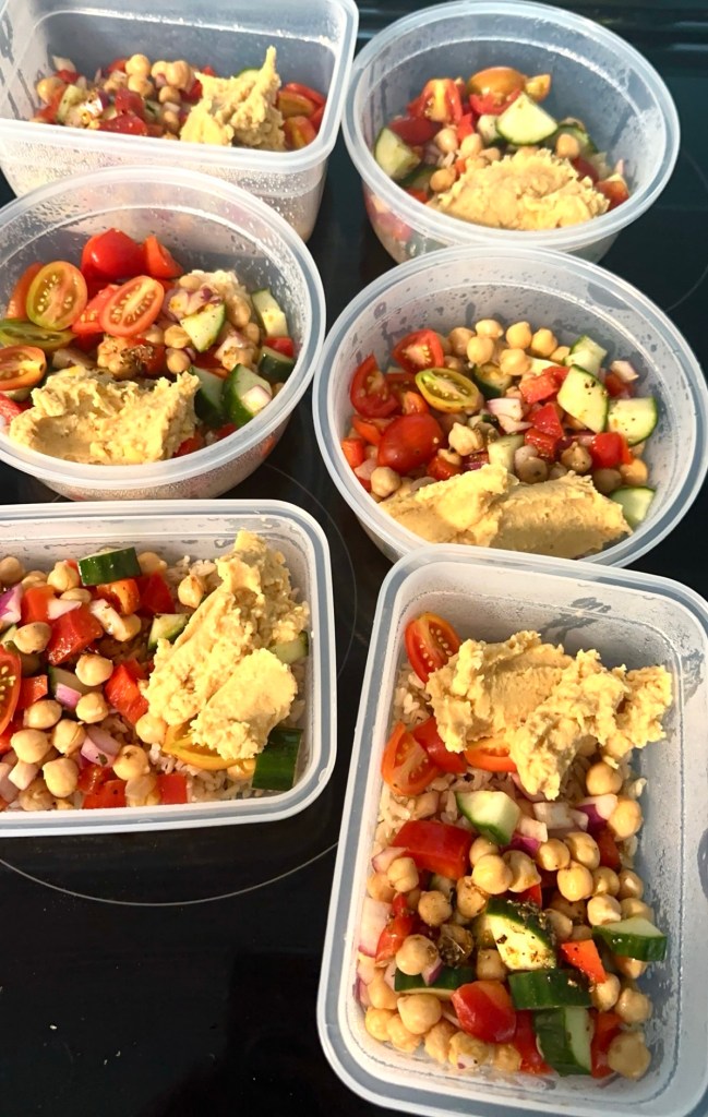 I always like to take recipes and give them a little tweak to create my version. This dish is no different. When I want to meal prep and have a healthier meal, especially in the summer, this is my go to. It’s very simple and can be modified to anyone’s palate. I start with cooked brown rice as my base. When meal prepping, maybe 1/2 cup per dish. I don’t want too much rice that it feels like that’s all I’m eating but enough to help fill me up. I then add the following items, in no particular order and as much or as little as I prefer for each bowl – Persian cucumbers sliced and then quartered, chickpeas, halved cherry tomatoes, chopped red onion, feta cheese. Sometimes I will add hummus just to give a creamy texture. There is a fairly easy dressing you can make consists of olive oil, lemon juice, a little Dijon mustard, garlic, dried oregano. Or you can find a citrus vinaigrette dressing at the grocery store that will do just fine. When meal prepping, I don’t add the dressing until I actually want to eat the bowl so it doesn’t make the veggies soggy.